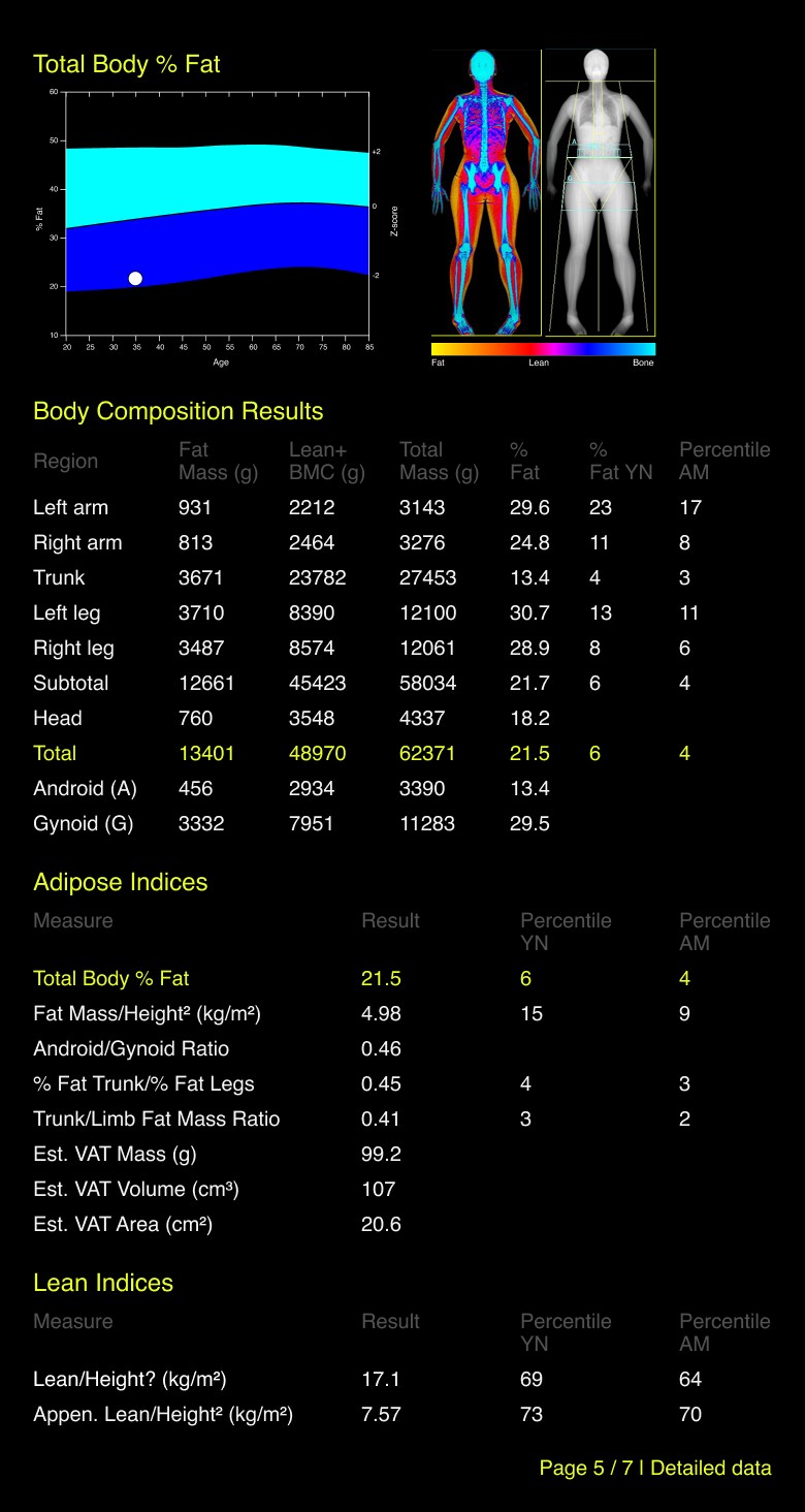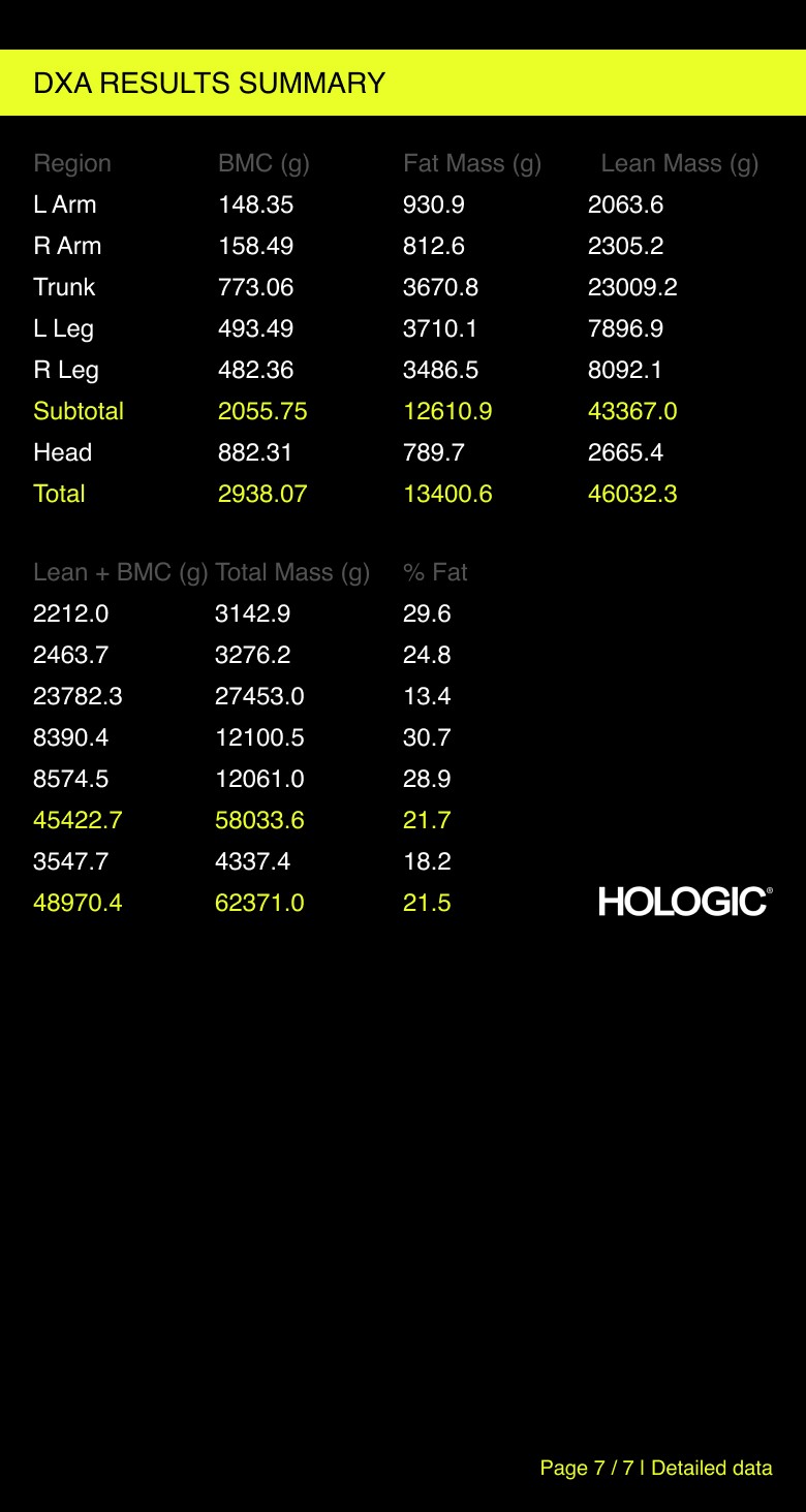 Your standard DEXA report, breaking down fat and lean mass body part by body part